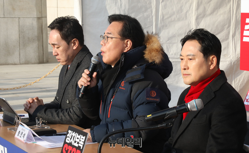 송언석 국민의힘 원내대표가 15일 오전 국회 본청앞 천막농성장에서 열린 최고위원회의에서 모두발언을 하고 있다.