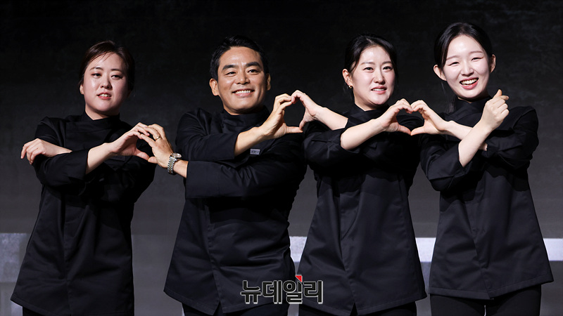 술빚는 유주모, 프렌치 파파, 중식마녀, 아기 맹수가 17일 오전 서울 종로구 JW메리어트동대문스퀘어에서 열린 넷플릭스 예능 '흑백요리사: 요리 계급 전쟁2' 제작발표회에서 포즈를 취하고 있다.