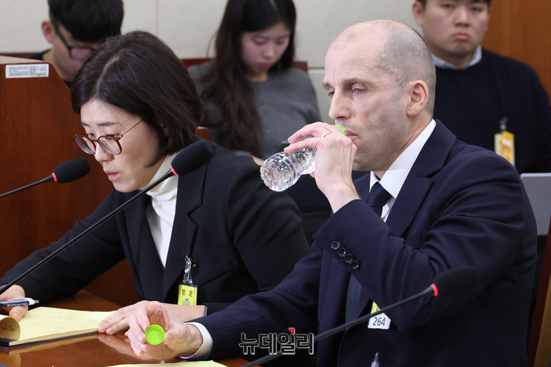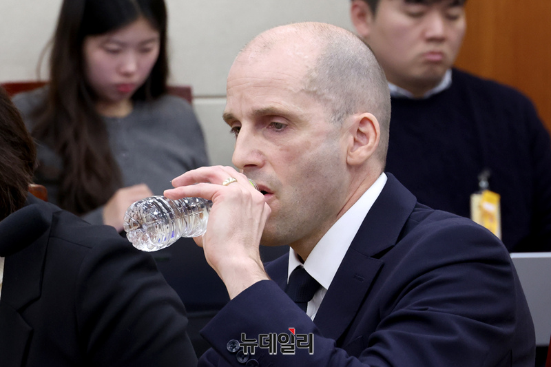 해롤드 로저스 쿠팡 임시 대표가 17일 오전 국회 과학기술정보방송통신위원회 전체회의에서 열린 쿠팡 침해사고 관련 청문회에서 물을 마시고 있다.