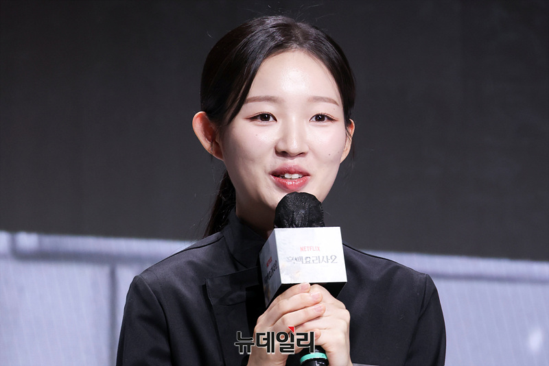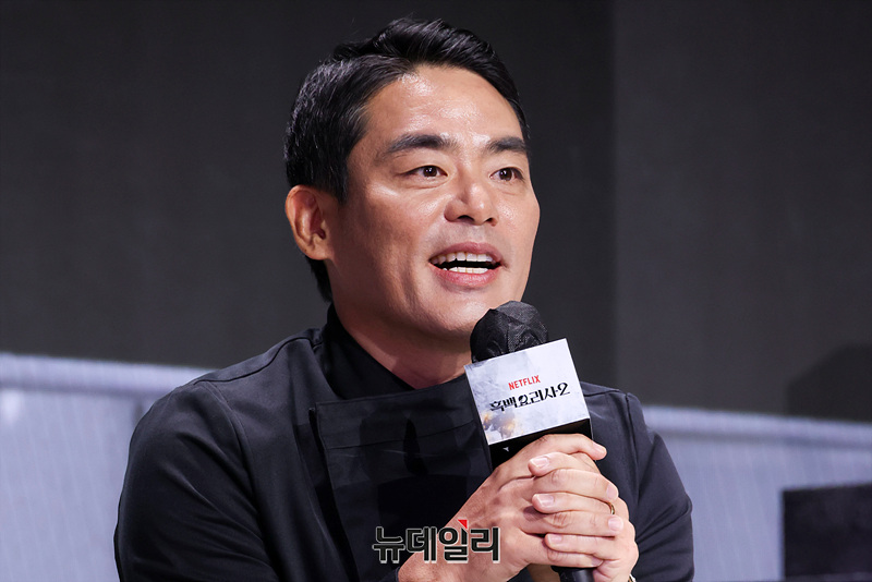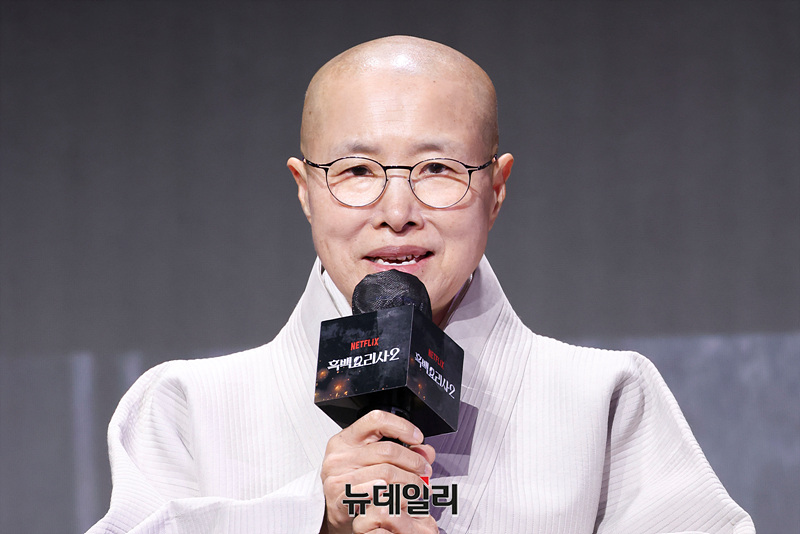 정호영(왼쪽부터), 후덕죽, 선재스님, 손종원, 김학민 PD, 김은지 PD, 술빚는 유주모, 프렌치 파파, 중식마녀, 아기 맹수가 17일 오전 서울 종로구 JW메리어트동대문스퀘어에서 열린 넷플릭스 예능 '흑백요리사: 요리 계급 전쟁2' 제작발표회에서 인사말을 하고 있다.
