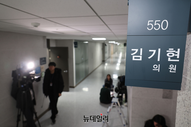 김건희특검이 '로저비비에 클러치백 수수 의혹'과 관련해 김기현 의원에 대한 압수수색에 착수한 17일 오전 국회 의원회관 김기현 의원 사무실에서 취재진이 대기하고 있다.