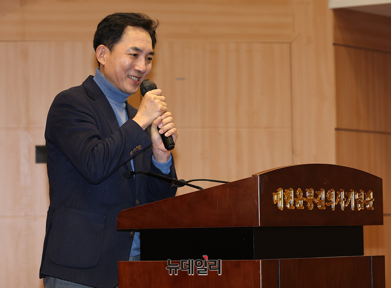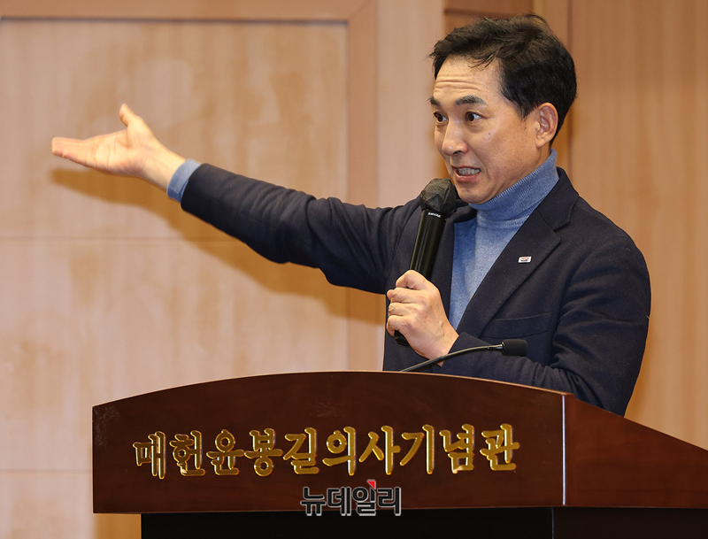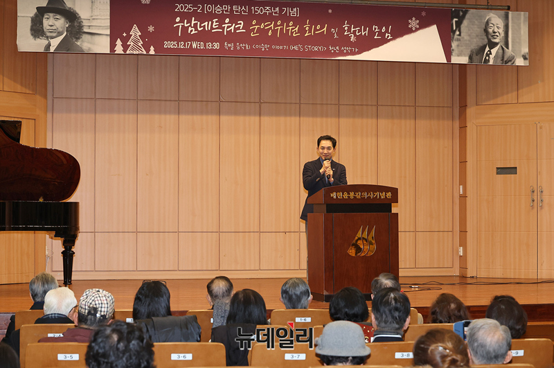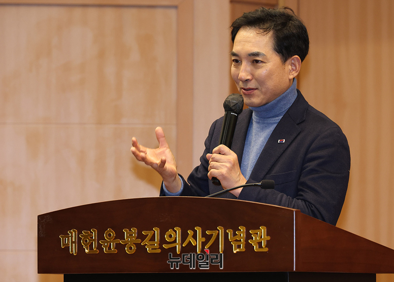박민식 전 보훈부 장관이 17일 오후 서울 서초구 매헌윤봉길의사기념관에서 열린 우남네트워크 운영위원 확대모임에서 축사를 하고 있다.