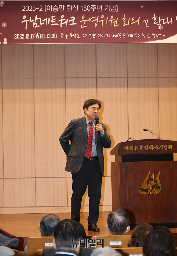 이희천 국가정보대학원 교수가 17일 오후 서울 서초구 매헌윤봉길의사기념관에서 열린 우남네트워크 운영위원 확대모임에서 강연을 하고 있다.