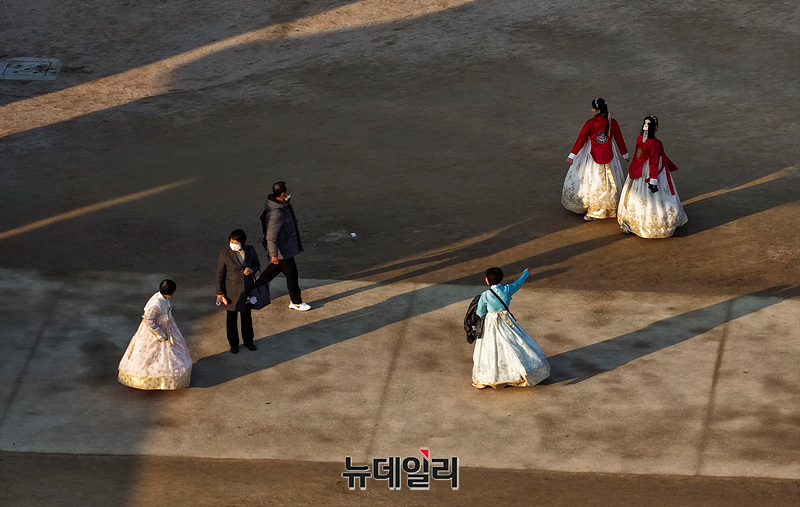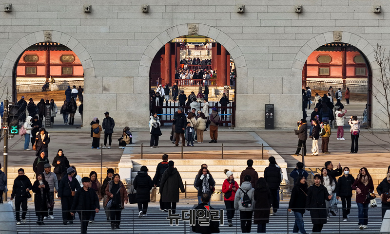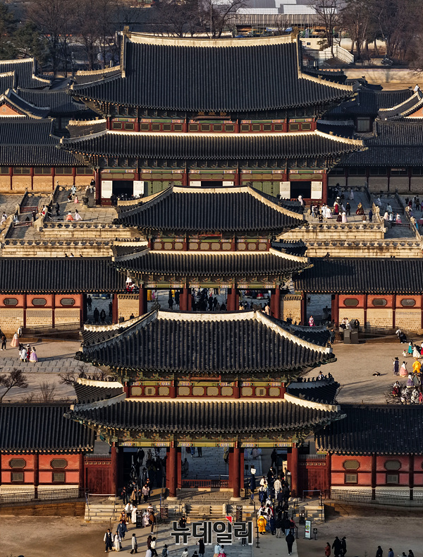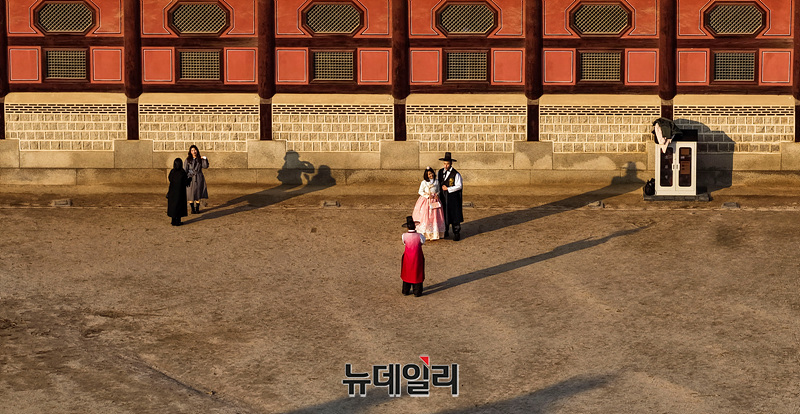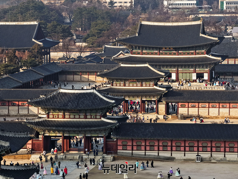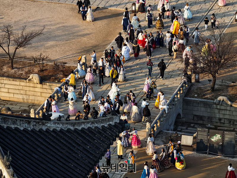 포근한 날씨가 이어지는 가운데 17일 오후 서울 종로구 경복궁이 한복을 입은 관광객들로 북적이고 있다.