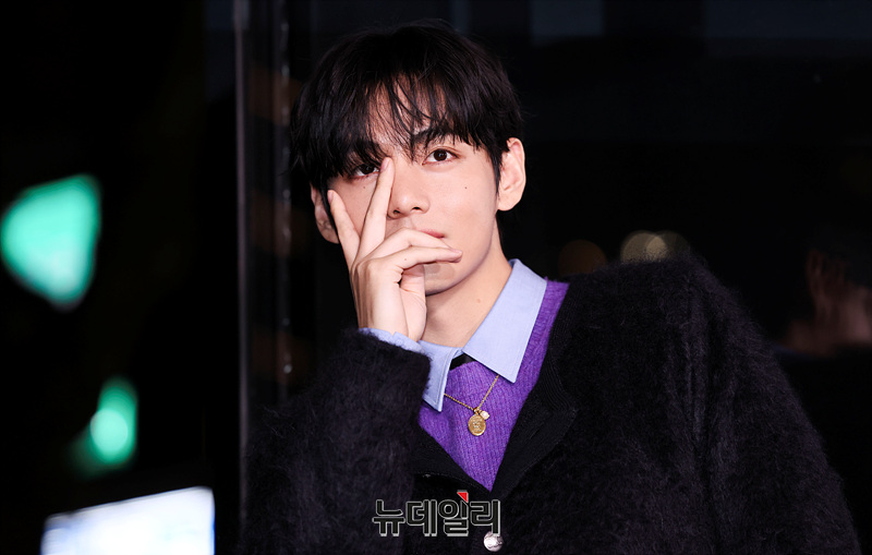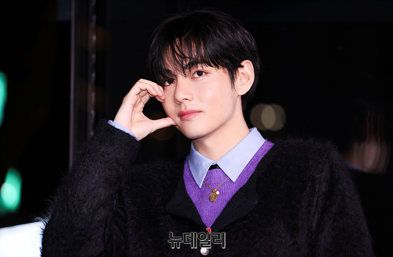 방탄소년단 뷔가 17일 오후 서울 강남구 셀린느 플래그십 스토어에서 열린 행사 참석을 마치고 떠나며 포즈를 취하고 있다.