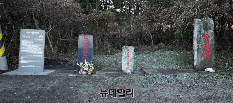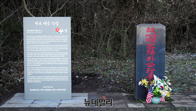 제주 4.3 사건 당시 진압 책임자였던 고 박진경 대령에 대한 국가 유공자 지정 취소 검토가 진행중인 가운데 18일 오전 제주시에 위치한 박진경 추도비 옆에 제주4·3평화재단, 제주4·3희생자유족회가 공동으로 설치한 안내판이 세워져 있다. (제주=서성진 기자)