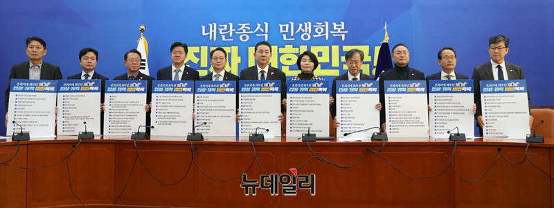 김병기 더불어민주당 원내대표 및 참석자들이 18일 오전 국회에서 열린 정책조정회의에서 '민생, 개혁법안을 가로막는 국민의힘 규탄' 퍼포먼스를 하고 있다.