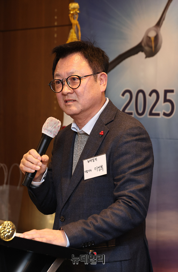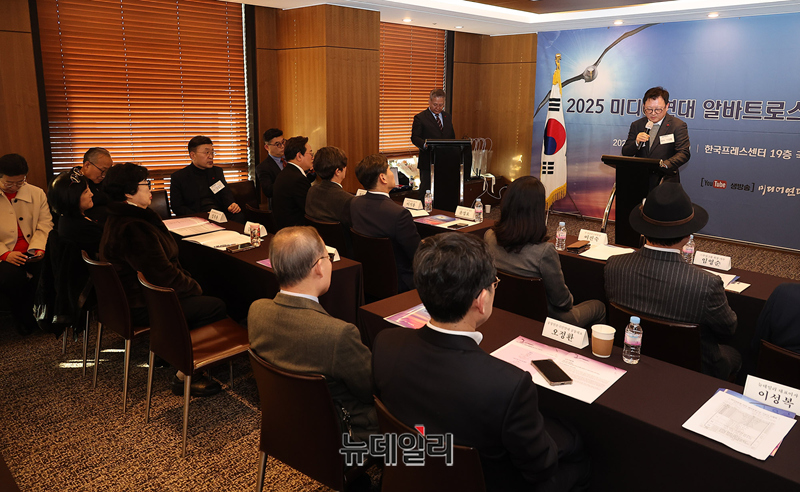 이성복 뉴데일리 대표가 18일 오후 서울 중구 한국프레스센터에서 열린 '2025 미디어연대 알바트로스상 시상식'에서 축사를 하고 있다. 이 대표는 2024년 언론 부문에서 알바트로스상을 수상했다.'미디어연대 알바트로스상'은 언론시민단체 미디어연대가 미디어를 비롯해 경제·문화·예술·교육·시민사회 등 각 분야에서 자유와 공정의 가치를 드높이며 탁월한 역할을 수행한 인물을 선정해 시상하는 상이다.올해 알바트로스상 수상자는 △윤정호 TV조선 뉴스9 앵커 △이기홍 전 동아일보 대기자가 알바트로스 특별상 수상자는 △이진숙 전 방송통신위원장 △임영순 ㈜부성그룹 회장이 각각 선정됐다.