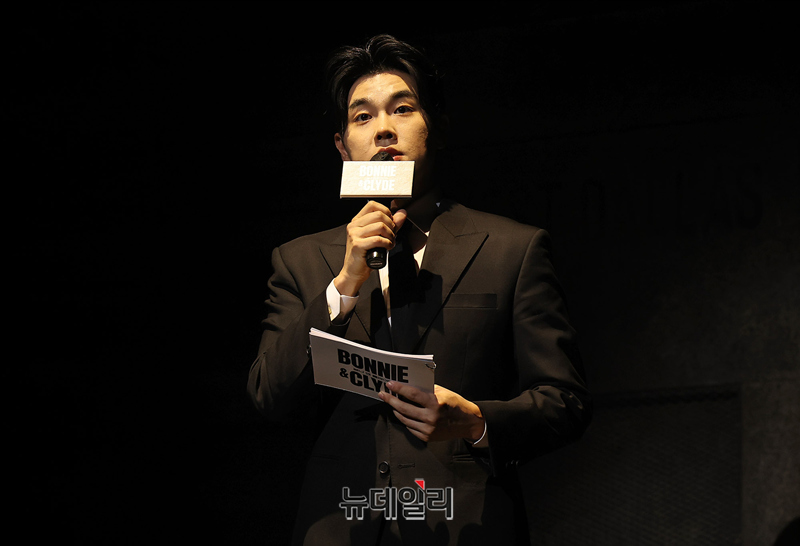 이인권 아나운서가 18일 오후 서울 종로구 홍익대 대학로 아트센터에서 열린 뮤지컬 '보니 앤 클라이드' 프레스콜에서 장면 소개를 하고 있다.