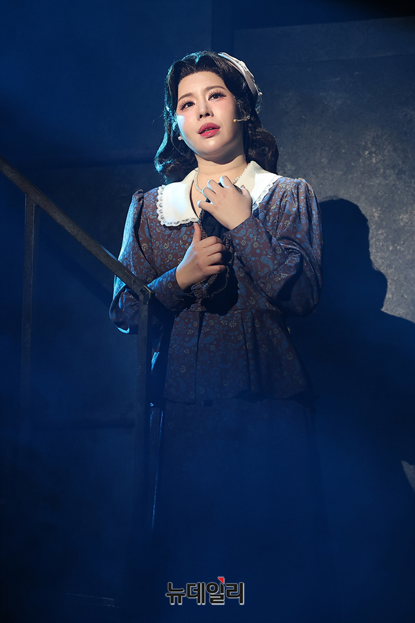 뮤지컬배우 윤지인이 18일 오후 서울 종로구 홍익대 대학로 아트센터에서 열린 뮤지컬 '보니 앤 클라이드' 프레스콜에서 하이라이트 장면을 시연하고 있다.