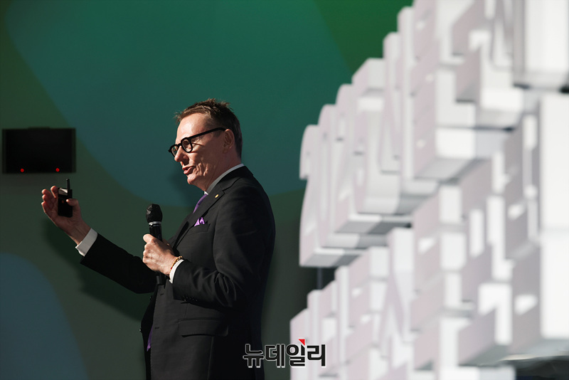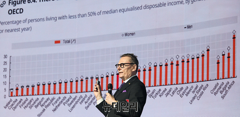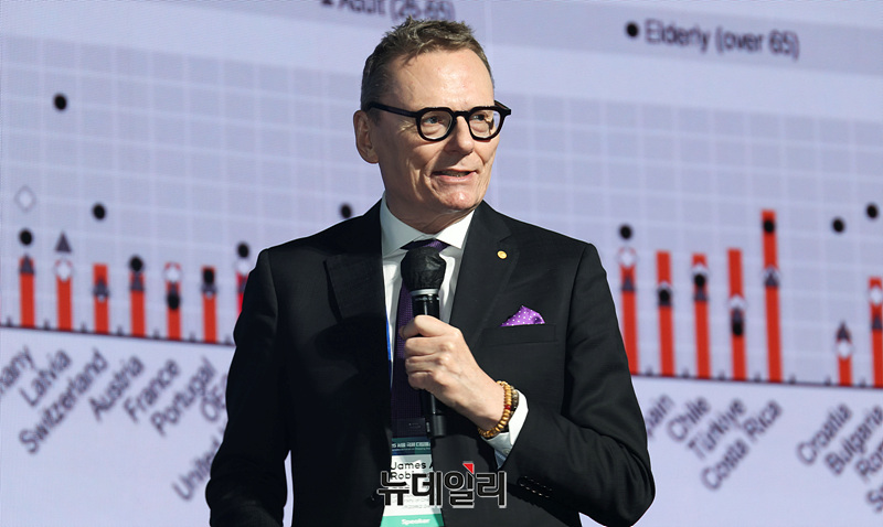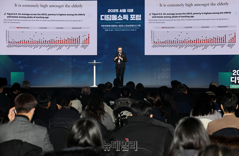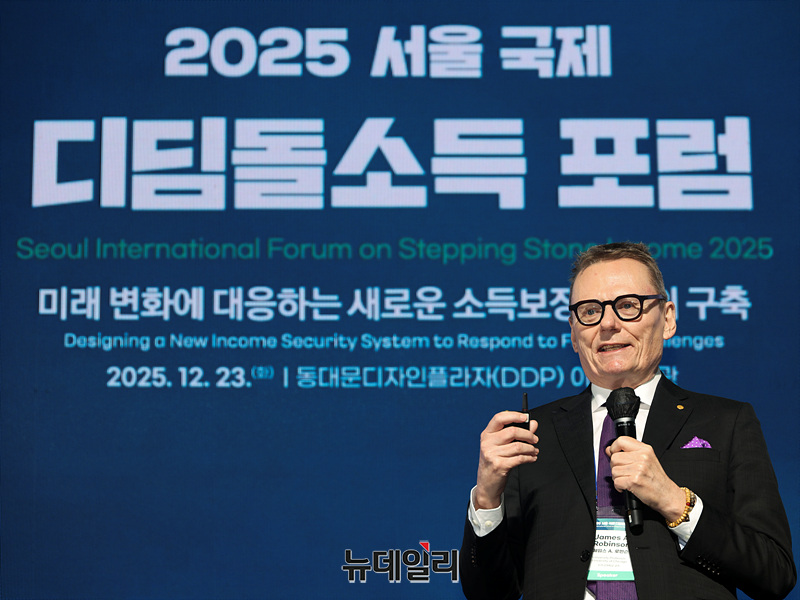 2024년 노벨경제학 수상자 제임스 A.로빈슨 교수가 23일 오전 서울 중구 동대문디자인플라자에서 열린 2025 서울 국제 디딤돌소득 포럼에서 기조연설을 하고 있다.