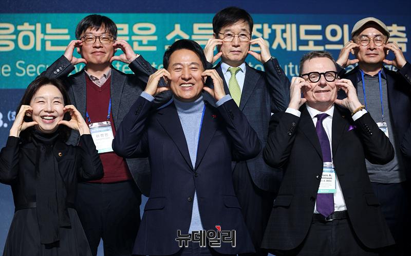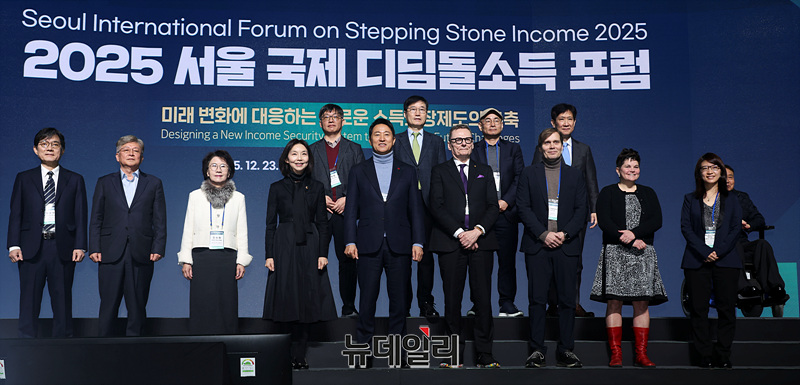오세훈 서울시장, 최호정 서울시의회 의장, 로버트 로빈슨 교수를 비롯한 참석자들이 23일 오전 서울 중구 동대문디자인플라자에서 열린 2025 서울 국제 디딤돌소득 포럼에서 기념촬영을 하고 있다.