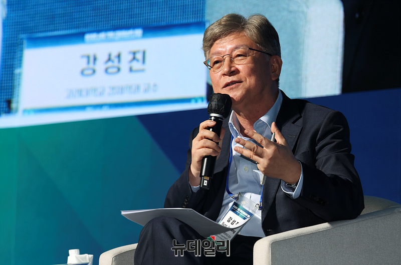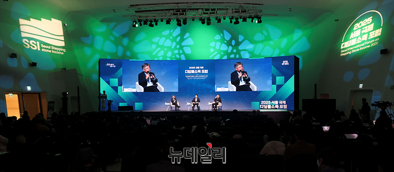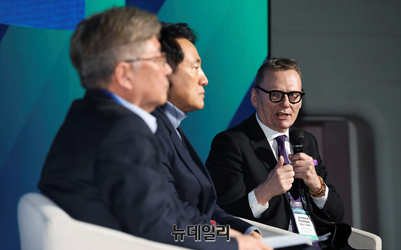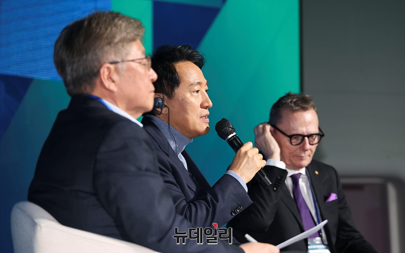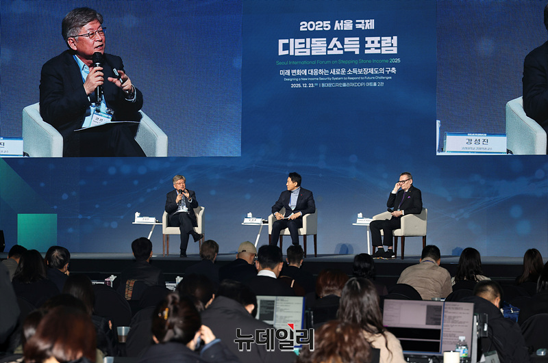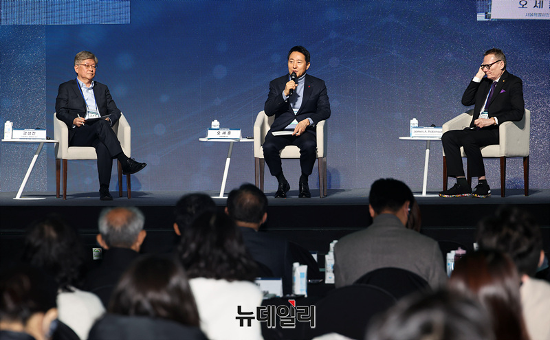 오세훈 서울시장, 로버트 로빈슨 교수, 강성진 고려대학교 교수가 23일 오전 서울 중구 동대문디자인플라자에서 열린 2025 서울 국제 디딤돌소득 포럼에서 특별대담을 하고 있다.
