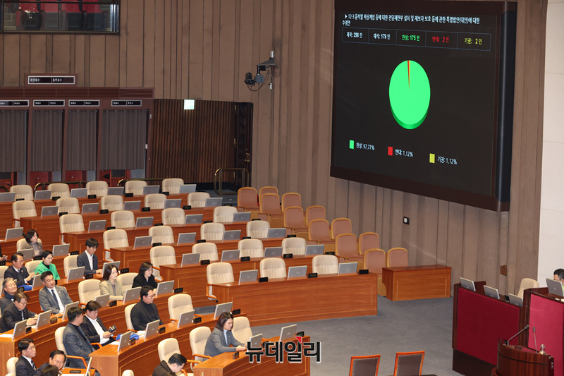 12·3 윤석열 비상계엄 등에 대한 전담재판부 설치 및 제보자 보호 등에 관한 특별법안(대안)이 23일 국회에서 열린 본회의에서 통과되고 있다.