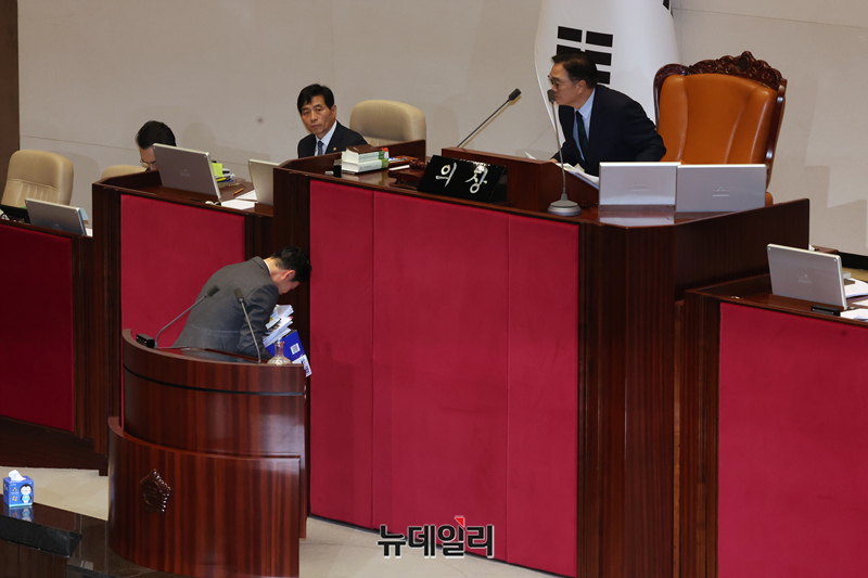 장동혁 국민의힘 대표가 23일 오전 국회에서 열린 본회의에서 '내란전담재판부설치 관련 법안'에 대한 반대 무제한토론(필리버스터)을 마치고 단상에서 내려오고 있다.
