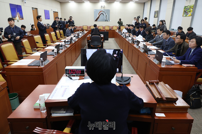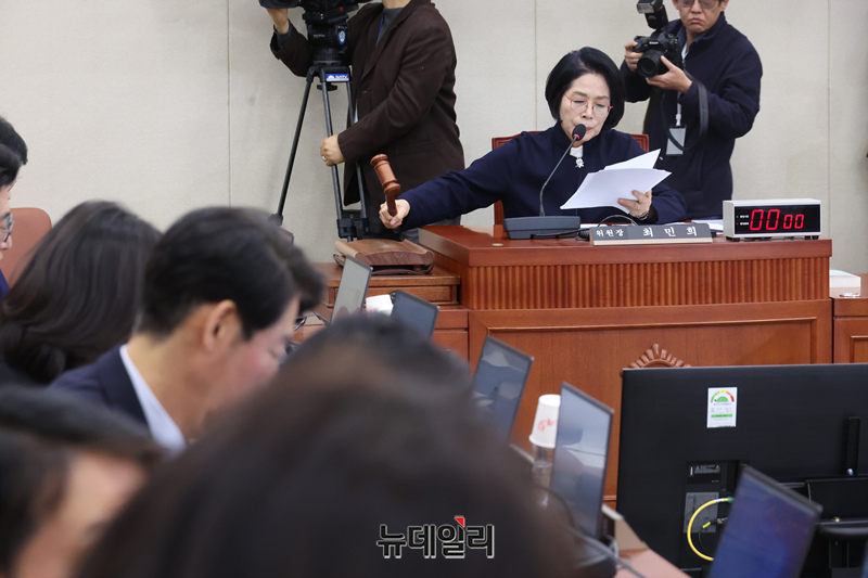 최민희 국회 과방위원장이 23일 오전 국회에서 열린 과학기술정보방송통신위원회 전체회의에서 쿠팡 침해사고 및 개인정보 유출, 불공정 거래, 노동환경 실태 파악과 재발방지 대책 마련을 위한 청문회 실시계획서 채택의 건을 통과시키고 있다.
