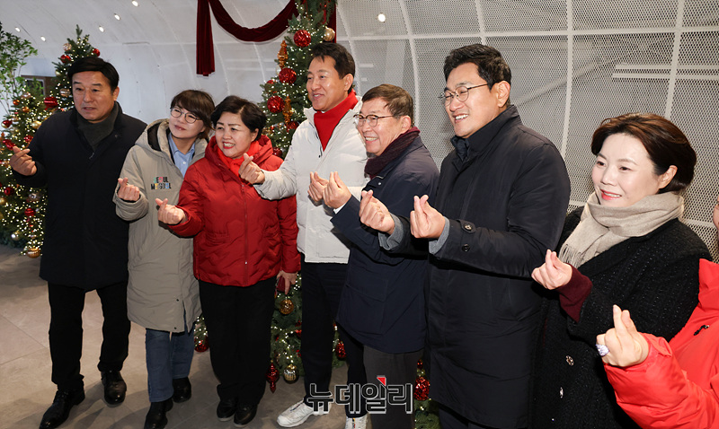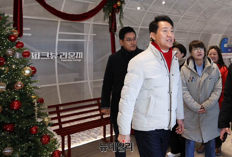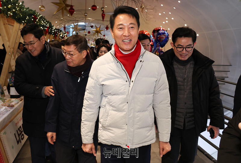 오세훈 서울시장이 24일 오후 서울 광진구 뚝섬한강공원에서 열린 한강플플-한강 크리스마스 마켓 행사장을 찾아 현장을 둘러보고 있다.