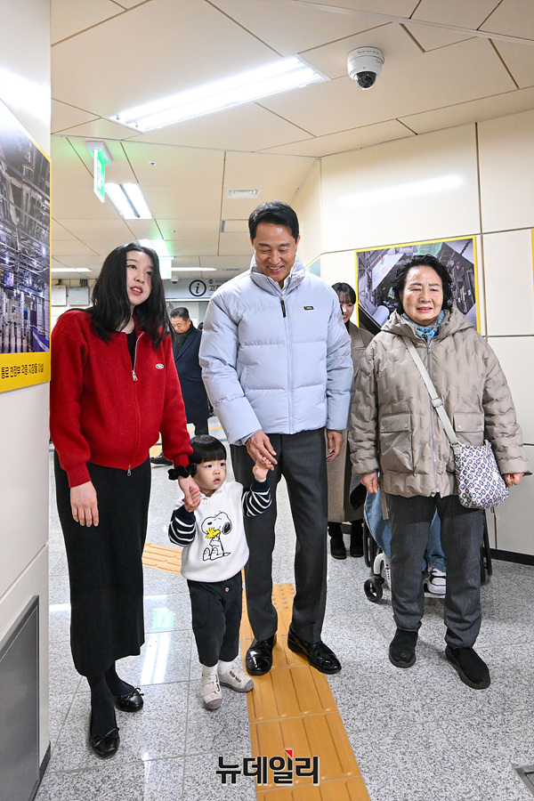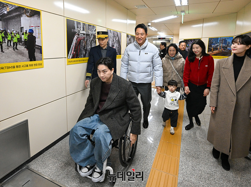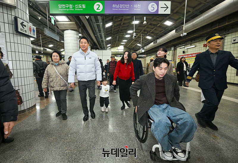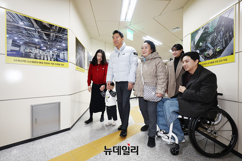오세훈 서울시장이 29일 오후 서울 강서구 까치산역에서 열린 전역사 1역사 1동선 확보 기념행사에서 교통약자 대표들과 함께 엘리베이터에 탑승하고 있다.