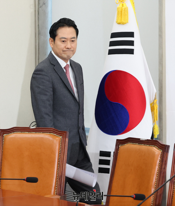 장동혁 국민의힘 대표가 2일 오후 국회에서 열린 기자간담회에 참석하기 위해 입장하고 있다.