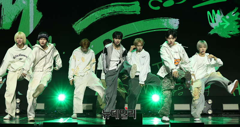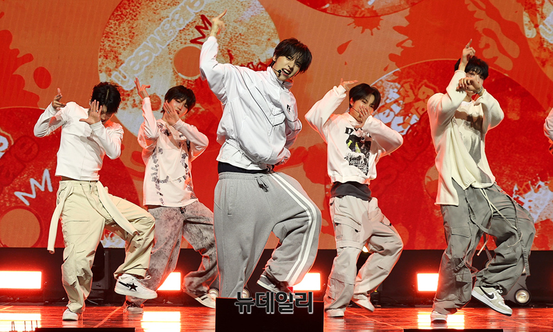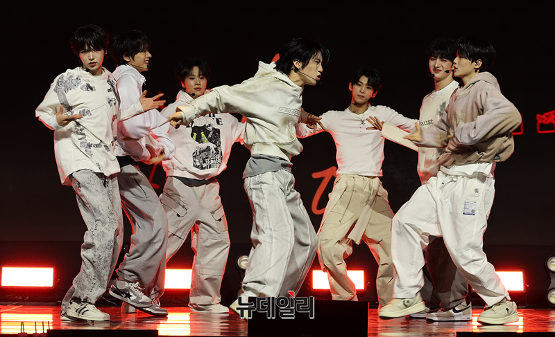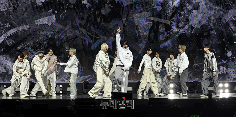 메가 보이밴드 idntt(아이디엔티티)가 5일 오후 서울 용산구 블루스퀘어에서 열린 앨범 yesw8are(예스위아) 쇼케이스에서 타이틀곡 무대를 선보이고 있다.