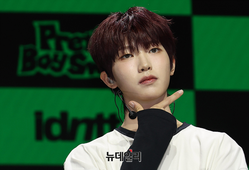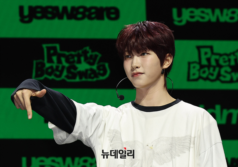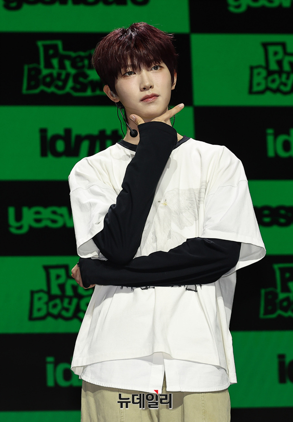 메가 보이밴드 idntt(아이디엔티티) 최경빈이 5일 오후 서울 용산구 블루스퀘어에서 열린 앨범 yesw8are(예스위아) 쇼케이스에서 포즈 취하 있다.