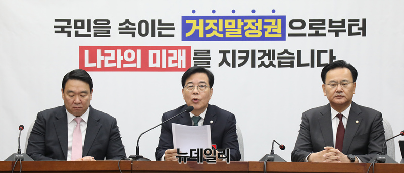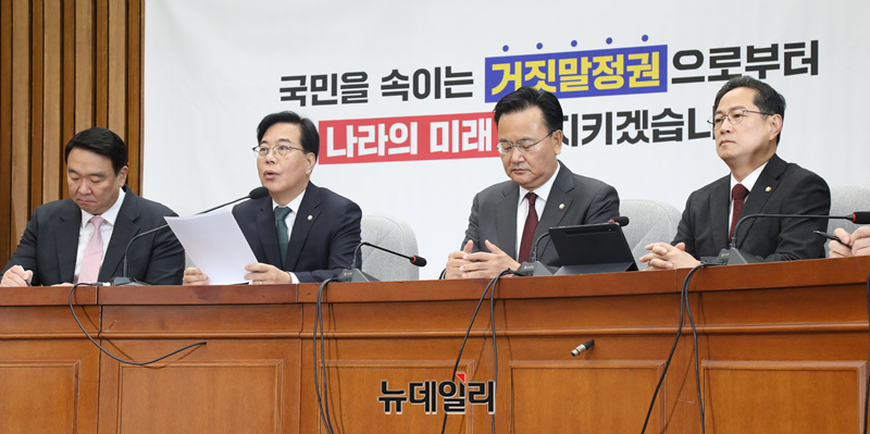 송언석 국민의힘 원내대표가 6일 오전 국회에서 열린 원내대책회의에서 모두발언을 하고 있다.