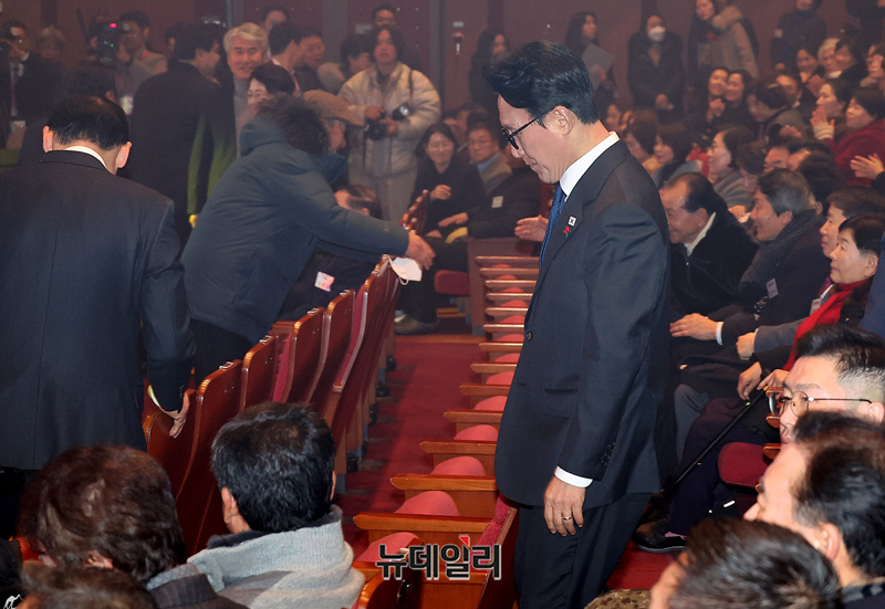 김민석 국무총리가 6일 오후 서울 영등포아트홀에서 열린 영등포구 신년인사회에서 구민들에게 새해인사로 큰절을 올리고 있다.