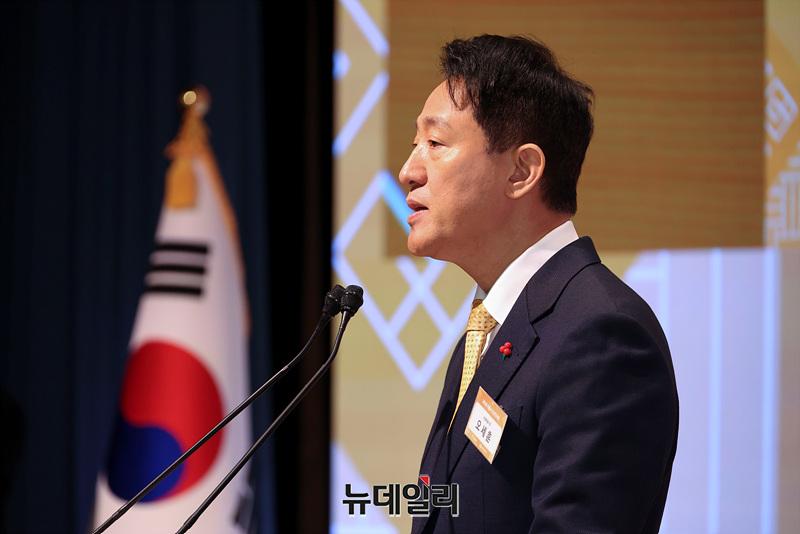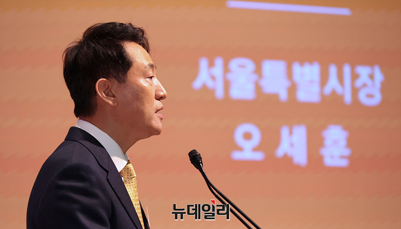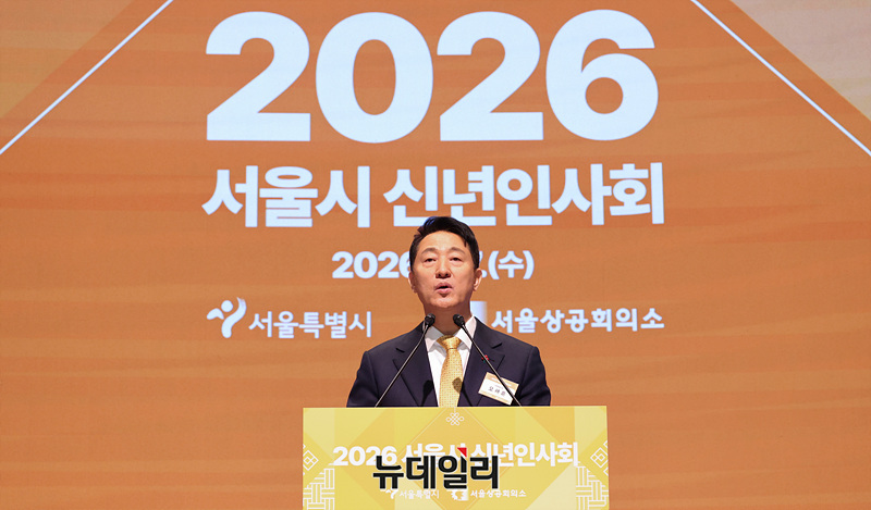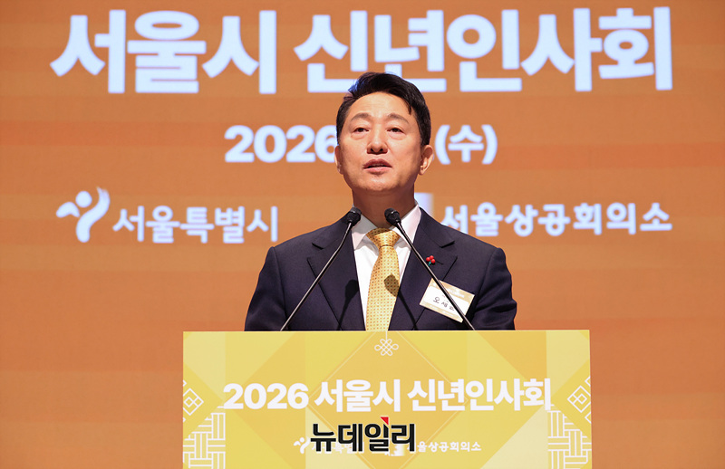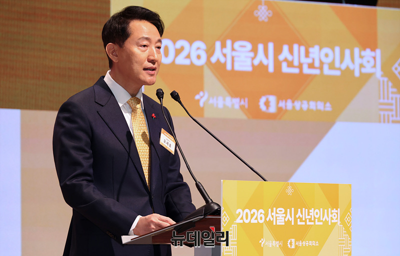 오세훈 서울시장이 7일 오전 서울 중구 대한상공회의소 국제회의장에서 열린 서울시 신년인사회에서 신년사를 하고 있다.