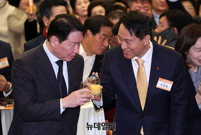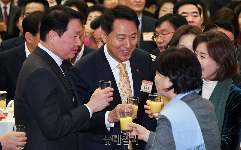 오세훈 서울시장과 최태원 대한상공회의소 회장이 7일 오전 서울 중구 대한상공회의소 국제회의장에서 열린 서울시 신년인사회에서 건배를 하고 있다.