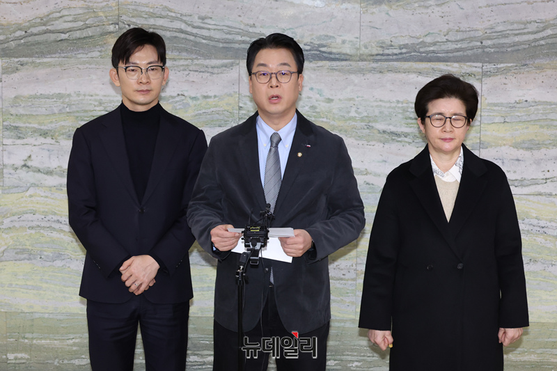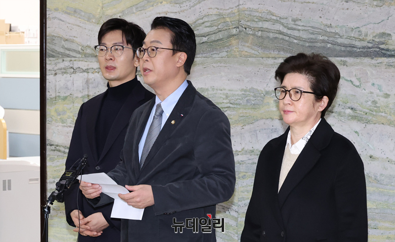 곽규택 국민의힘 원내수석대변인과 강선영, 박충권 원내부대표가 7일 오전 국회 의안과에서 '김병기·강선우 국회의원의 공천 뇌물 수수 의혹 사건 진상규명 특검법'을 제출하고 기자들의 질문에 답하고 있다.