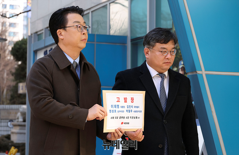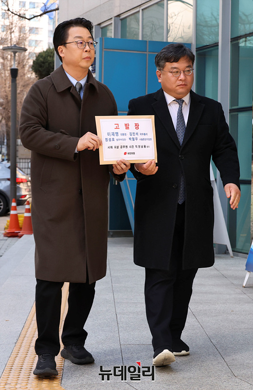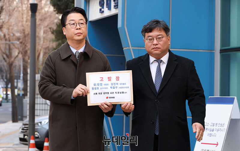 곽규택 국민의힘 법률자문위원장(왼쪽), 김기윤 법률자문위 부위원장이 7일 오전 서울 종로구 서울지방경찰청 민원실 앞에서 서해 피살 공무원 사건 관련 이재명 대통령, 김민석 국무총리, 정성호 법무부장관, 박철우 서울중앙지검장에 대한 직권남용 혐의 고발장을 제출하기 위해 이동하고 있다.