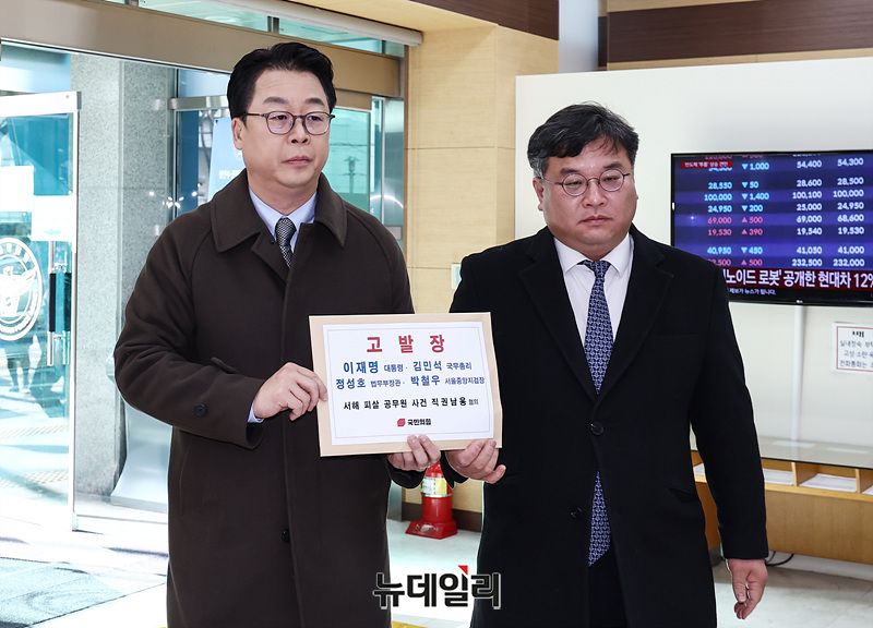곽규택 국민의힘 법률자문위원장(왼쪽), 김기윤 법률자문위 부위원장이 7일 오전 서울 종로구 서울지방경찰청 민원실에서 서해 피살 공무원 사건 관련 이재명 대통령, 김민석 국무총리, 정성호 법무부장관, 박철우 서울중앙지검장에 대한 직권남용 혐의 고발장을 제출하고 있다.