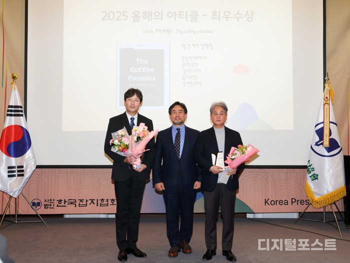한편 '2025 올해의 아티클' 최우수상은 디지털포스트 외에도 월간 커피가 공동 수상했다. 대상은 호텔&레스토랑, 우수상은 HR인사이트·공공정책·전라도닷컴이 각각 받았다. -