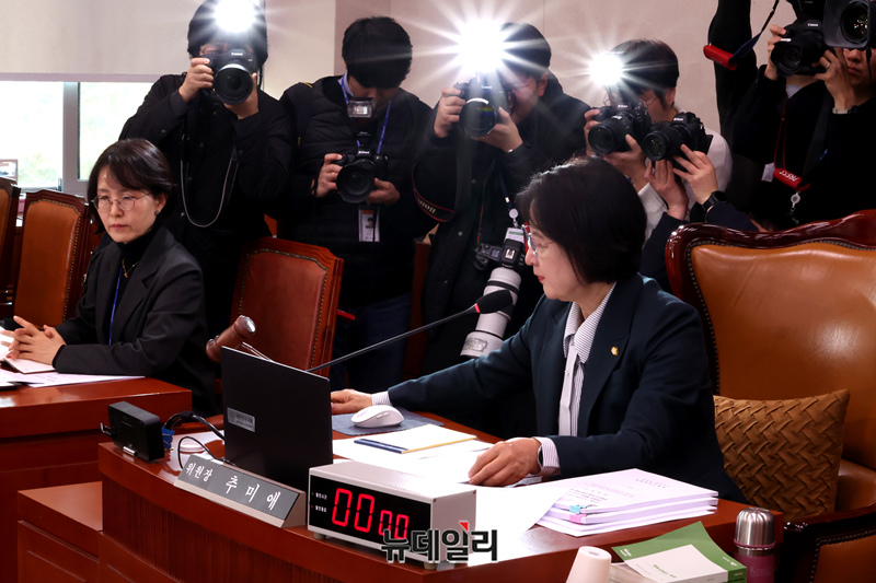 추미애 국회 법제사법위원장이 7일 오후 국회에서 열린 법사위 전체회의에서 의사봉을 두드리고 있다.