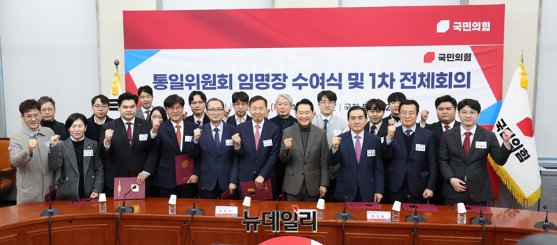 장동혁 국민의힘 대표 및 참석자들이 8일 오전 국회에서 열린 통일위원회 임명장 수여식 및 1차 전체회의에서 기념촬영을 하고 있다.