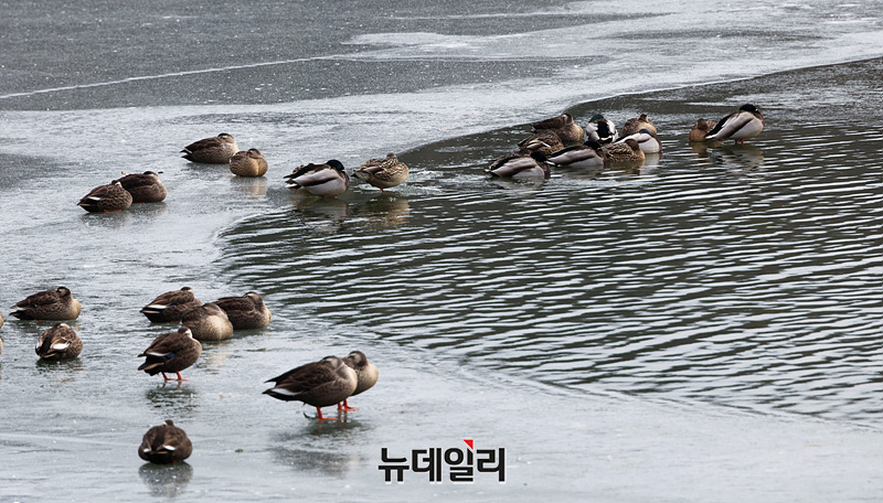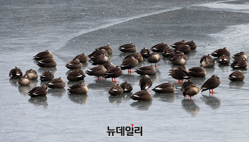 이번 주말 전국에 강력 한파가 예고된 가운데 9일 오후 경기 용인시 용담저수지에서 청둥오리들이 얼어붙은 저수지 위에 몸을 웅크린 채 모여 앉아 있다.