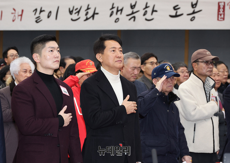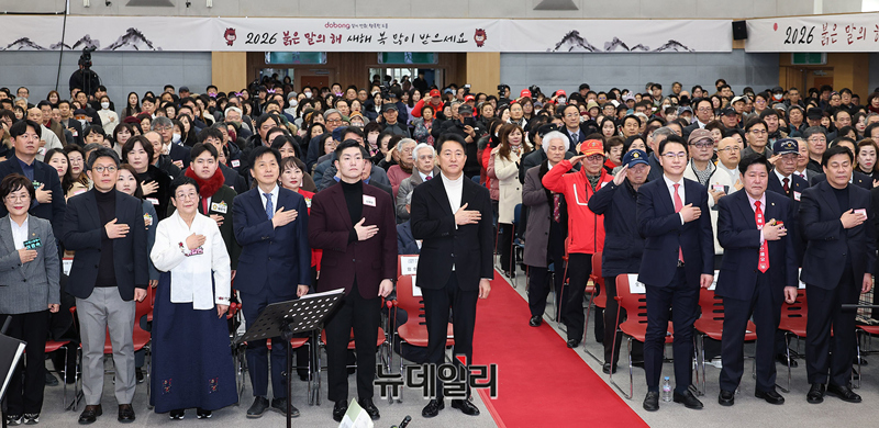 오세훈 서울시장, 김재섭(도봉갑) 국민의힘 의원이 9일 오후 서울 도봉구청 선인봉홀에서 열린 2026년 도봉구 신년인사회에서 국민의례를 하고 있다.