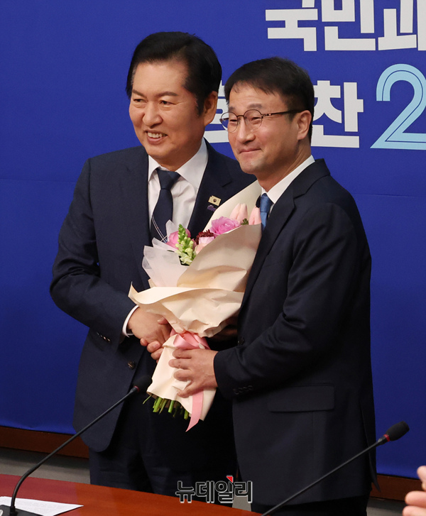 정청래 더불어민주당 대표와 한병도 원내대표가 12일 오전 국회에서 열린 최고위원회의에서 꽃다발을 들고 기념 촬영을 하고 있다.