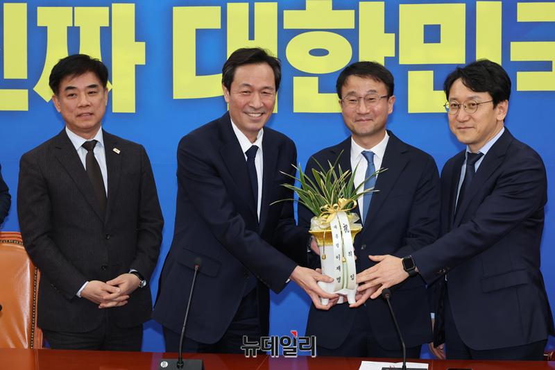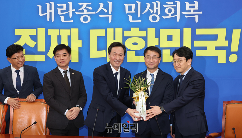 한병도 더불어민주당 신임 원내대표가 12일 국회에서 우상호 청와대 정무수석을 접견하고 이재명 대통령의 취임축하 난을 받아 들고 있다.