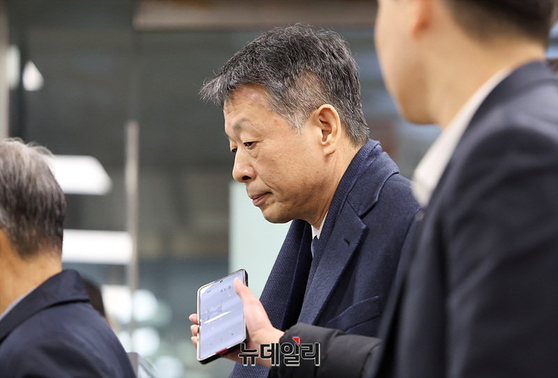 김광일 MBK파트너스 부회장 겸 홈플러스 공동대표가 13일 오전 서울 서초구 서울중앙지법에서 열린 구속 전 피의자 심문(영장실질심사)에 출석하고 있다.