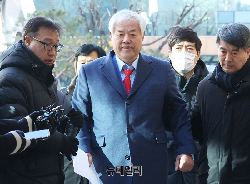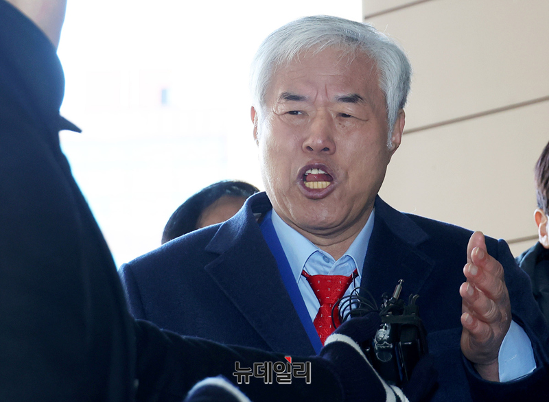 지난해 '서부지법 난동 배후 의혹'을 받고 있는 전광훈 사랑제일교회 목사가 13일 오전 서울 마포구 서울서부지법에서 열린 구속 전 피의자 심문(영장실질심사)에 출석하며 입장을 밝히고 있다.