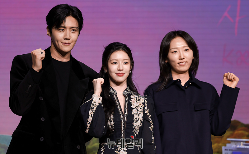 배우 김선호, 고윤정, 유영은 감독이 13일 오전 서울 강남구 조선팰리스에서 열린 넷플릭스 시리즈 '이 사랑 통역 되나요?' 제작발표회에서 포즈를 취하고 있다.