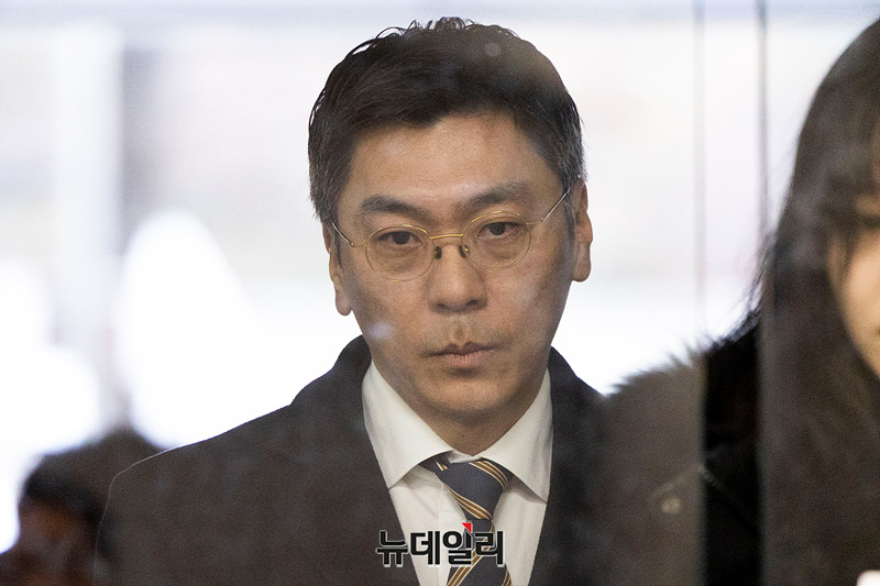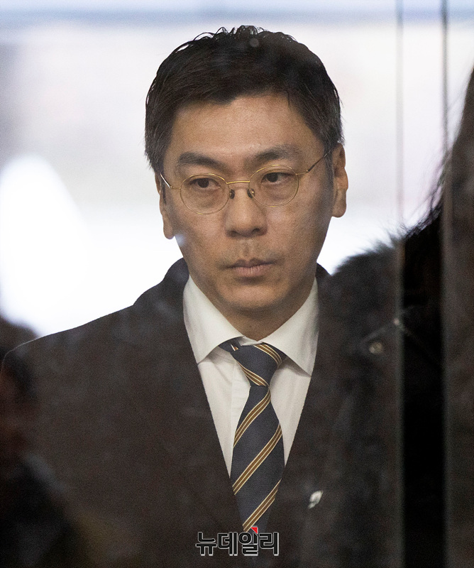 김정환 MBK파트너스 부사장이 13일 오전 서울 서초구 서울중앙지방법원에서 열린 구속 전 피의자 심문(영장실질심사)에 출석하고 있다.