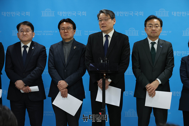 서왕진 조국혁신당 원내대표 및 의원단이 13일 오전 국회 소통관에서 중수청ㆍ공소청 설치 관련 논란에 대한 조국혁신당 입장 기자회견을 마치고 기자들의 질문에 답하고 있다.