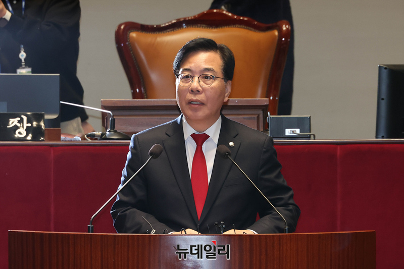 송언석 국민의힘 원내대표가 13일 국회에서 열린 국회의원·당협위원장 연석회의 및 의원총회에서 모두발언을 하고 있다.