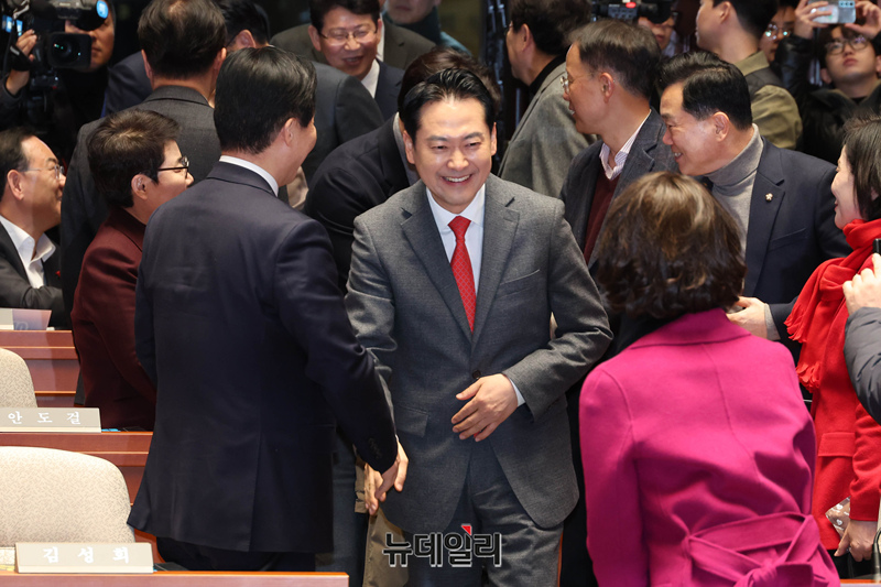 장동혁 국민의힘 대표가 13일 국회에서 열린 국회의원·당협위원장 연석회의 및 의원총회에 참석하며 인사를 나누고 있다.