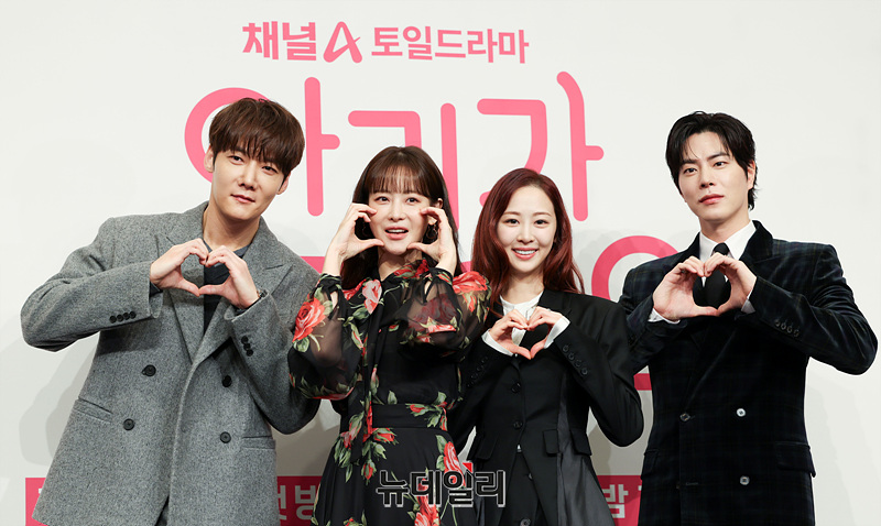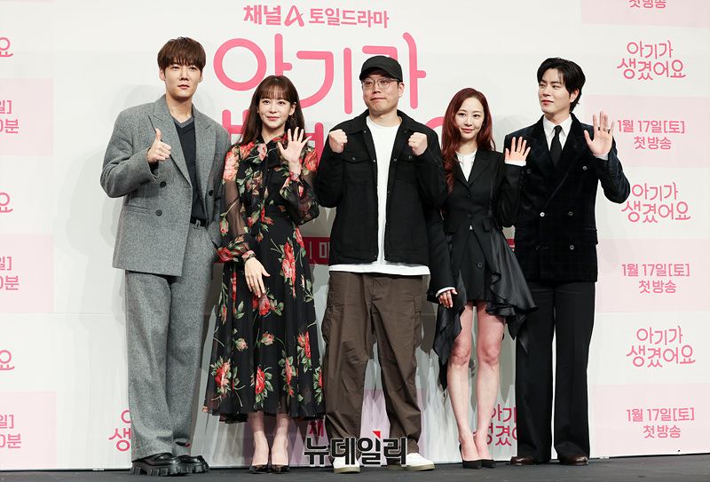 배우 최진혁, 오연서, 홍종현, 김다솜, 김진성 감독이 13일 오후 서울 구로구 더링크 호텔에서 열린 채널A 토일드라마 '아기가 생겼어요' 제작발표회에서 포즈를 취하고 있다.