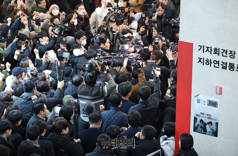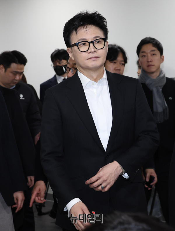 당원게시판 사태와 관련해 국민의힘에서 제명된 한동훈 전 대표가 14일 오후 국회 소통관에서 열린 긴급기자회견 직후 소통관을 나서고 있다. 소통관 입구에는 한동훈 지지자들이 대거 몰려 이름을 연호하며 응원했다.