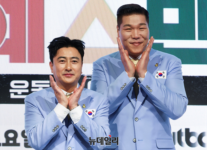 방송인 안정환과 서장훈이 14일 오후 서울 여의도 페어몬트 앰배서더 서울에서 열린 JTBC 예능 '예스맨' 제작발표회에서 포즈를 취하고 있다.
