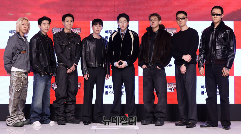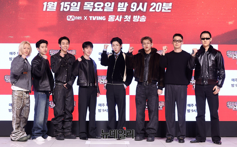 프로듀서를 맡은 출연자들이 15일 오전 서울 강남구 엘리에나 호텔에서 열린 Mnet 쇼미더머니12 제작발표회에서 포즈를 취하고 있다. 쇼미더머니12는 15일 밤 9시 20분 첫 방송으로 Mnet과 티빙을 통해 방송된다.